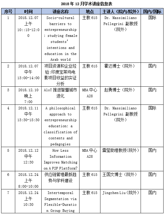 2018年12月,我院教师积极邀请海内外知名学者来校举办讲座,加强内外部学术交流。